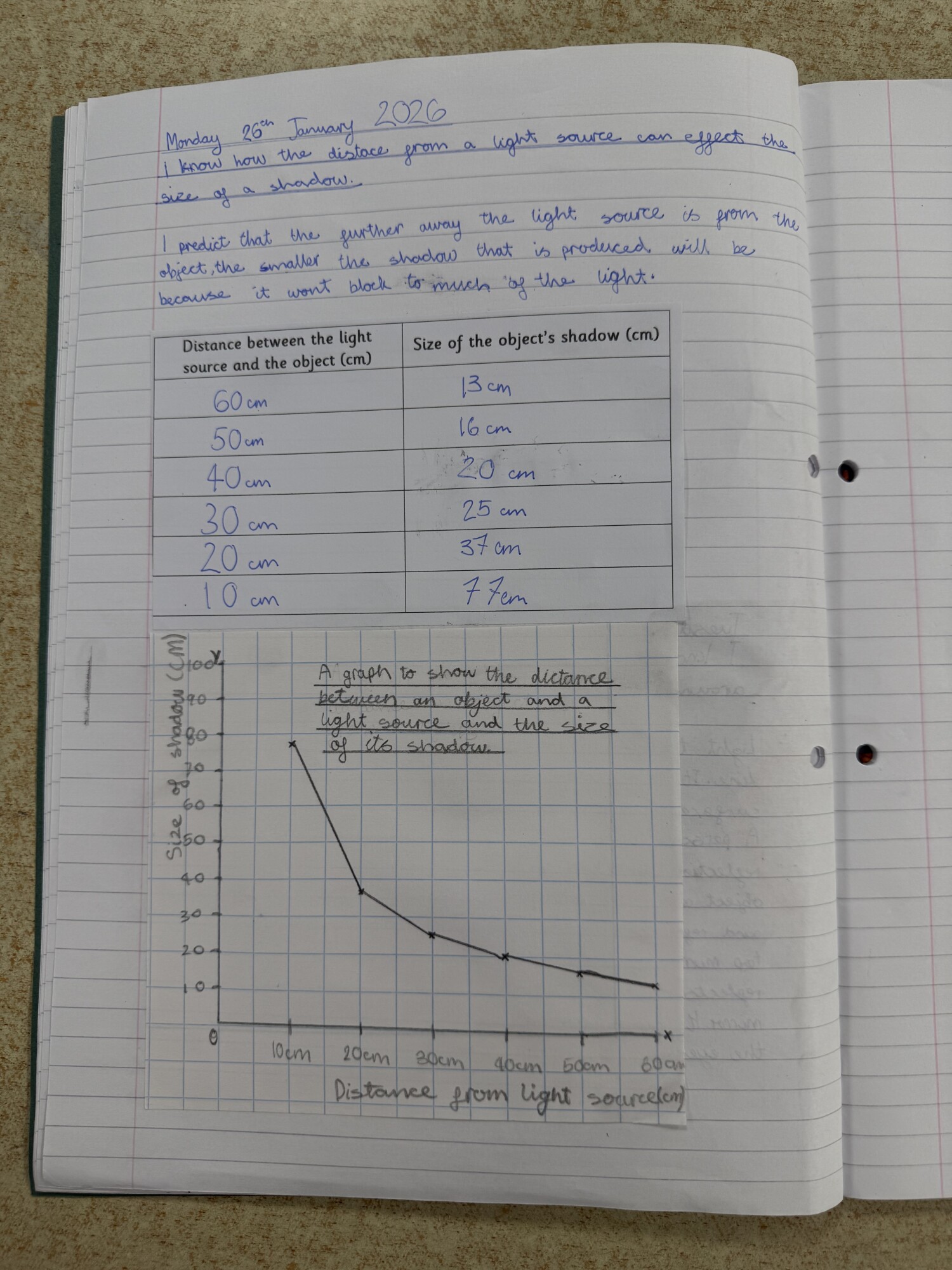 In Science, Year 6 have been learning about light. We investigated whether the distance an object is from the light source affects the size of the shadow it produces. After conducting a fair test, we presented our results in a graph. (January 2026)