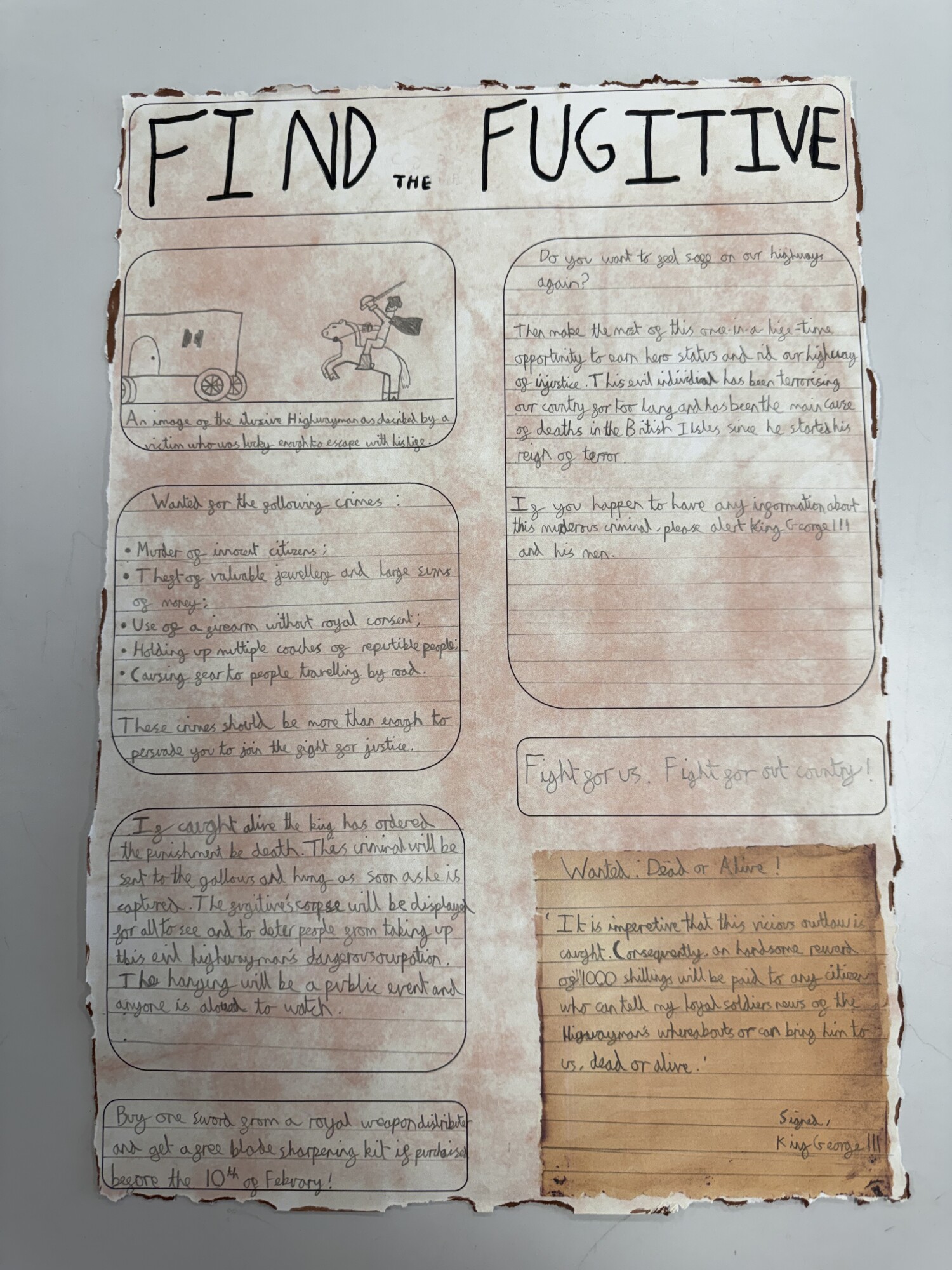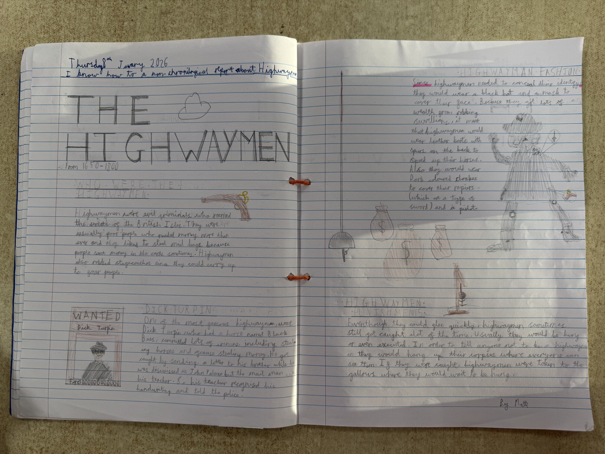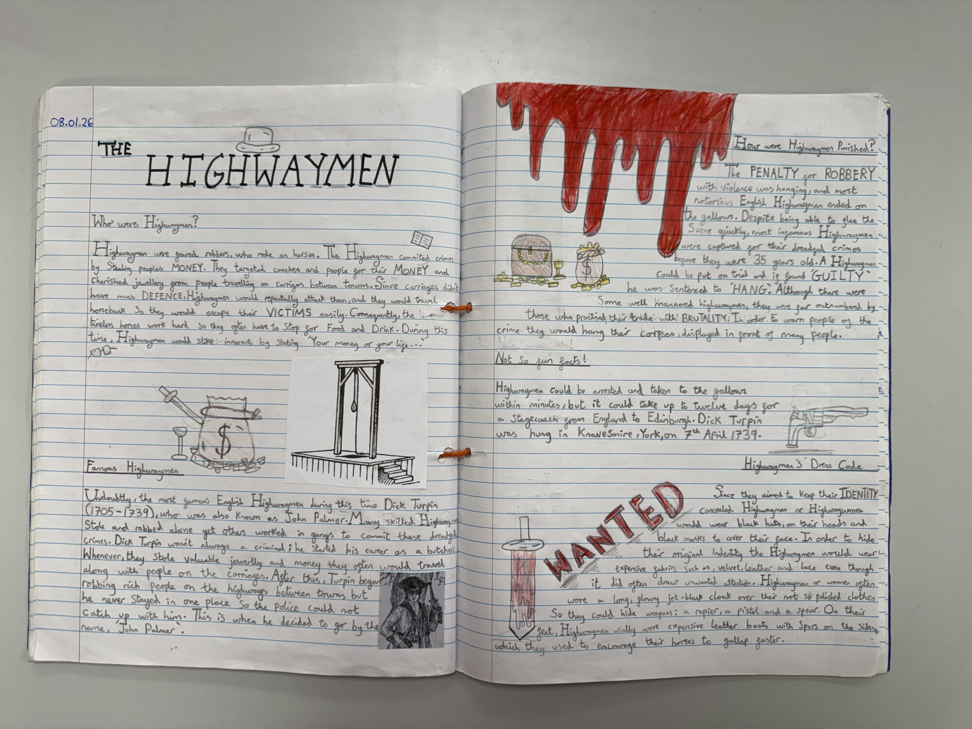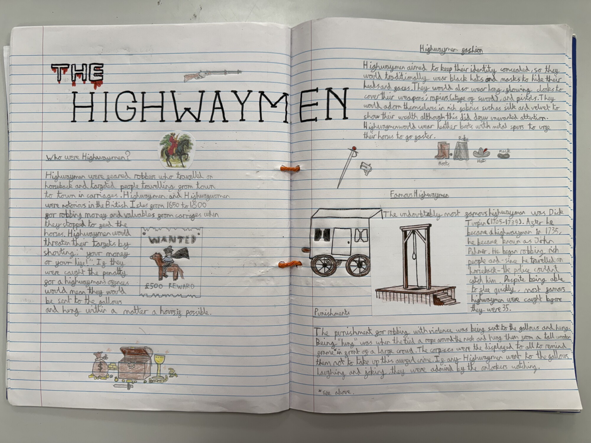In English, Year 6 have produced detailed non-chronological reports on the history of highwaymen. We also created persuasive leaflets to help catch the Highwayman. (January 2026)