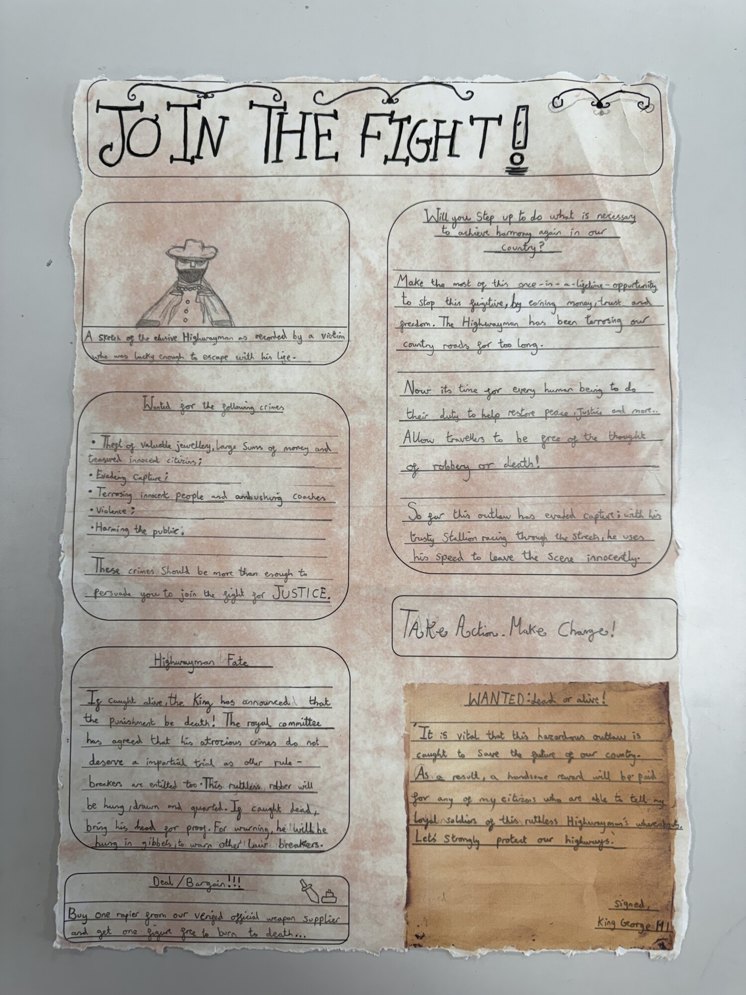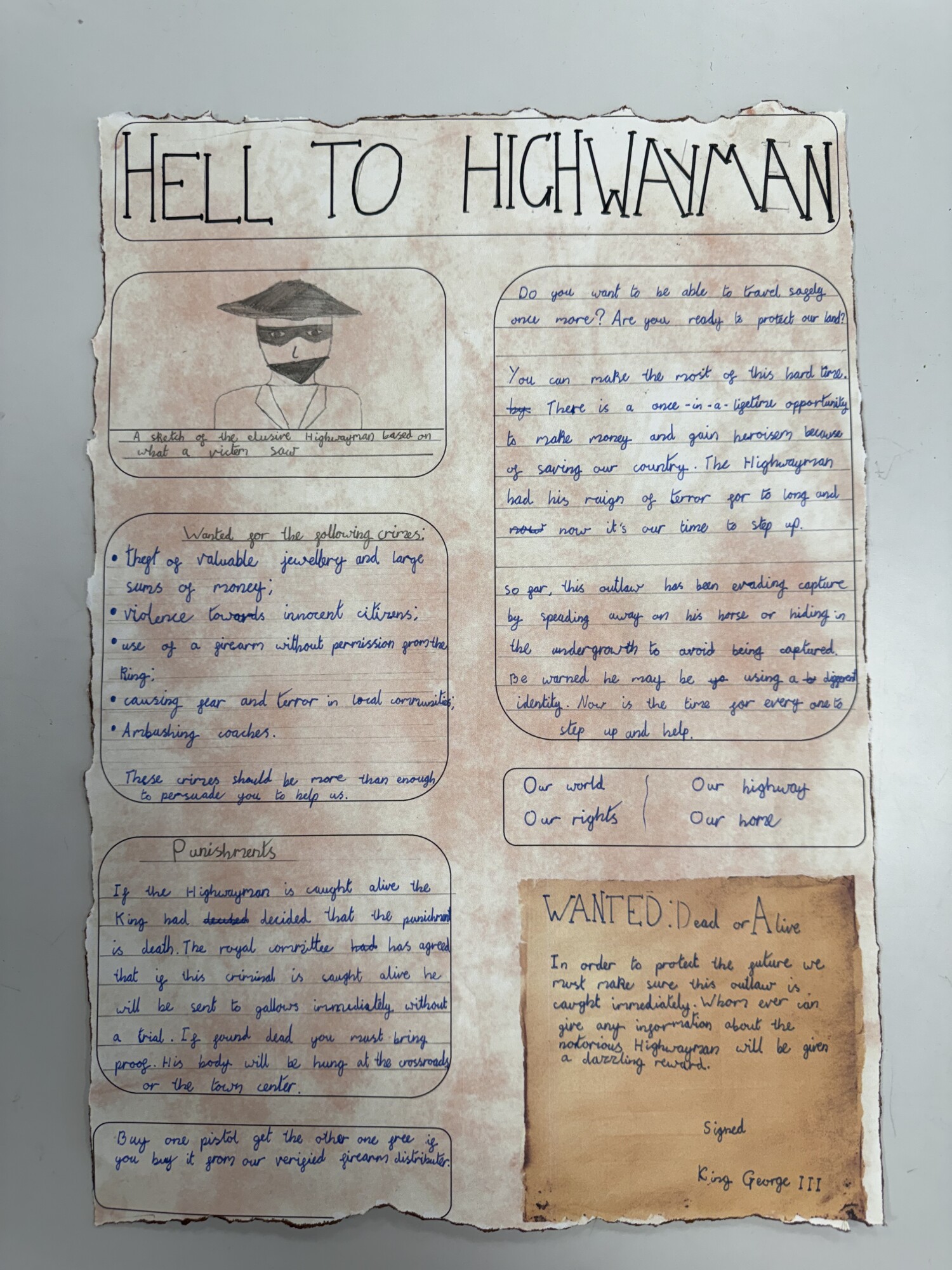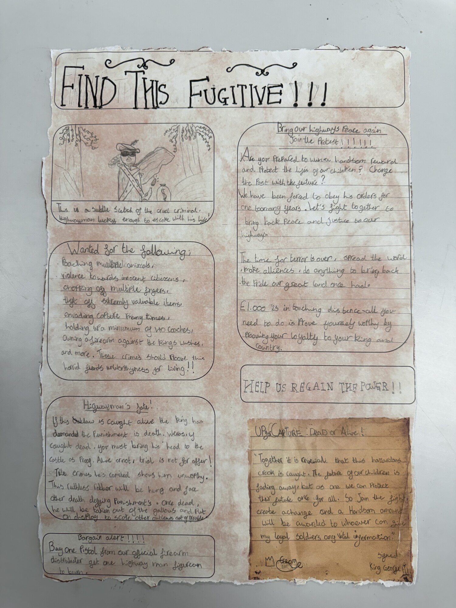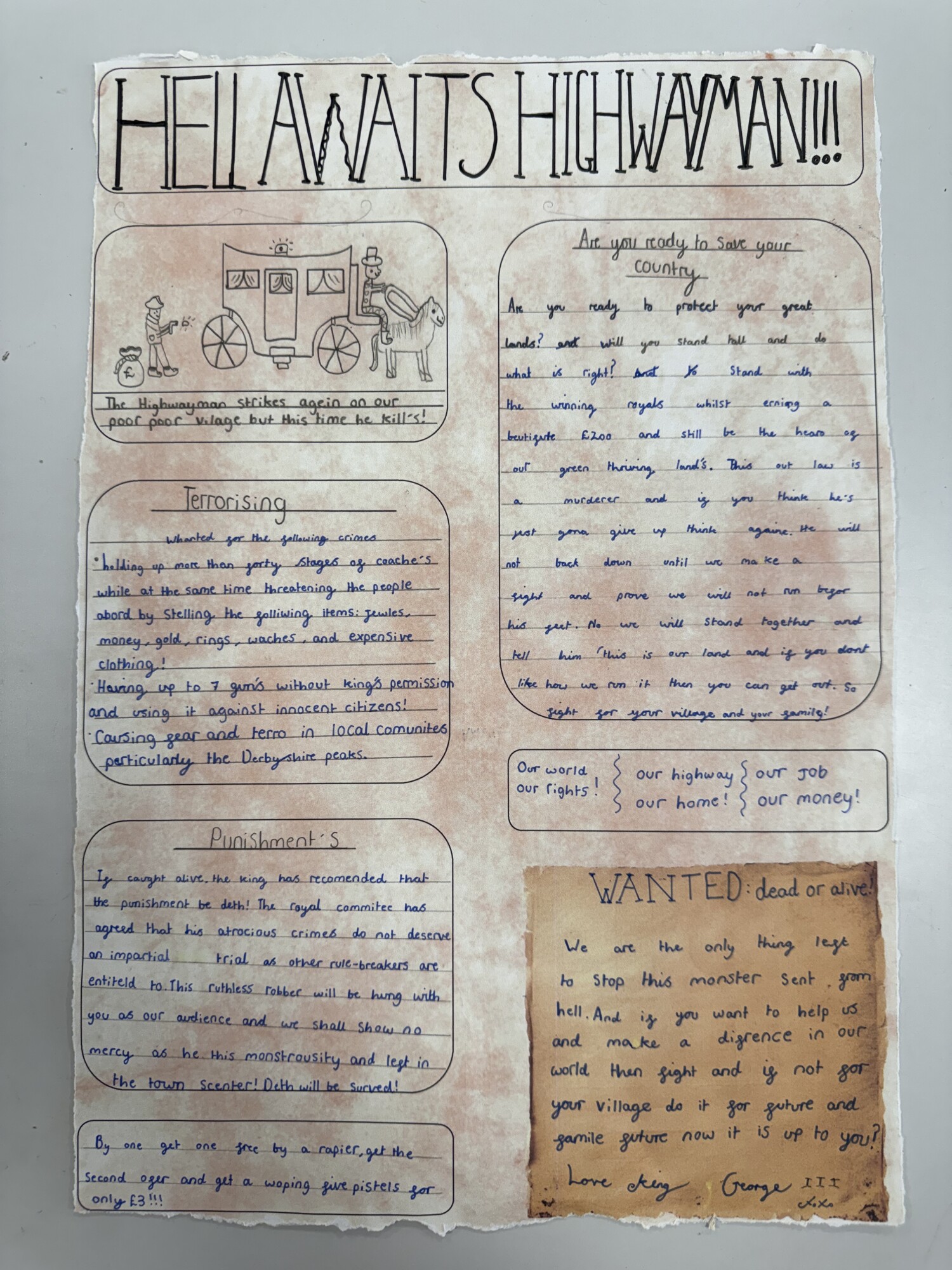 In English, Year 6 have produced detailed non-chronological reports on the history of highwaymen. We also created persuasive leaflets to help catch the Highwayman. (January 2026)