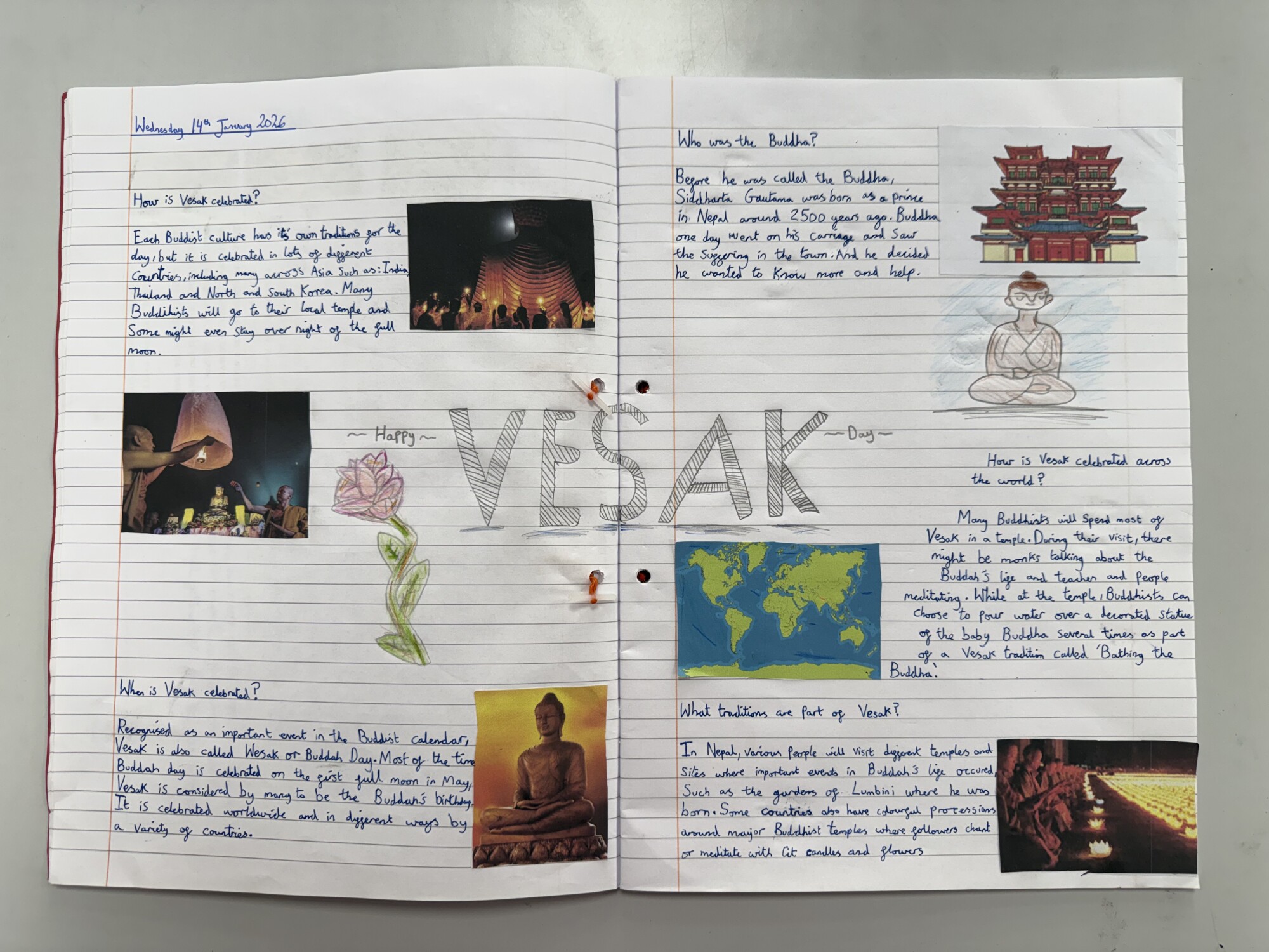In RE, we learnt about the Buddhist festival: Vesak and how it is celebrated. We carried out our own research and produced our work creatively in our books. (January 2026)